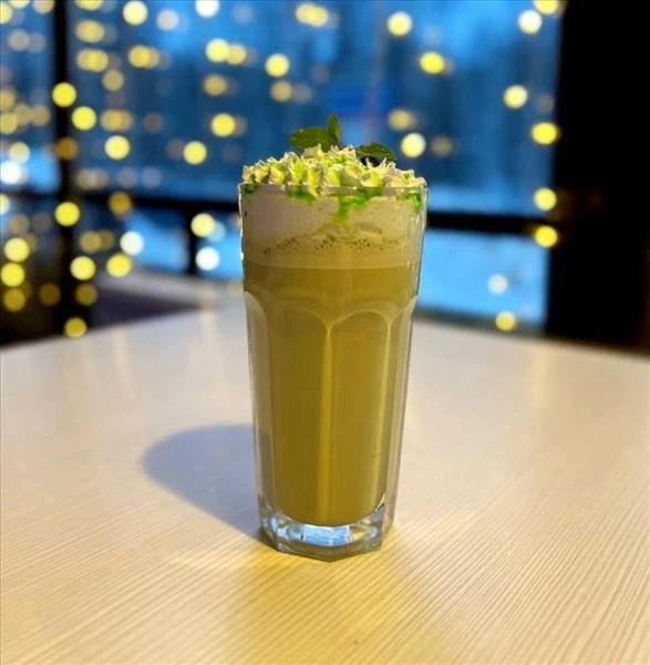 Одинарный эспрессо, молоко, мороженое пломбир, взбитые сливки, свежая мята, мятный сироп.