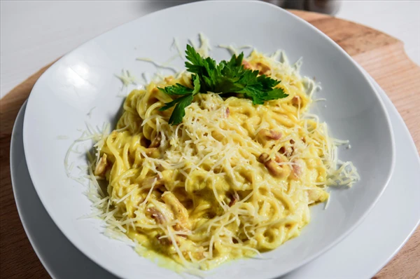 Спагетти, грудинка, сливки, сыр пармезан, яйцо куриное.