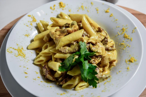 Паста пене, свинина, говядина, курица, вино, куркума, сливки, чеснок, лук.