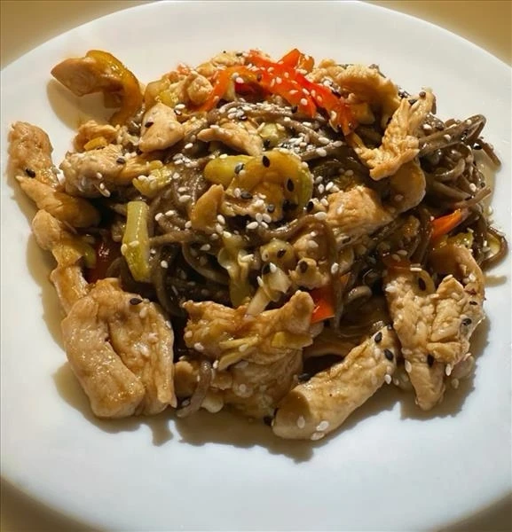 Куриное филе, соус терияки, гречневая лапша, перец болгарский, кабачки свежие, масло растительное, чеснок, корень имбиря, кунжут.