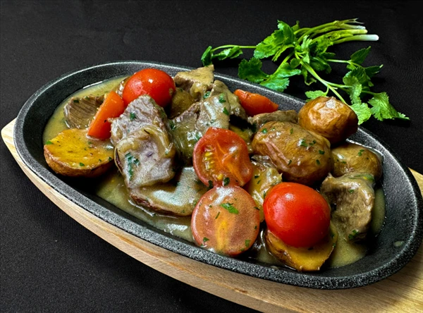 Нежная говядина с картофелем бейби, луком, томатами черри и зеленью.