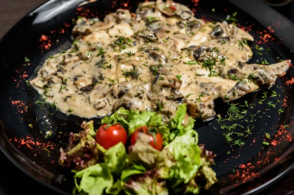 Куриное филе с шампиньонами и чесночком под соусом горгонзола, подается с томатами черри и салатом Айсберг.