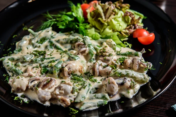 Осьминоги, стручковая фасоль, сливки, белое сухое вино, чеснок, подаются с листьями салата Айсберг и томатами черри.