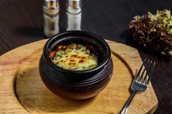 Свинина, картофель, шампиньоны, морковь, сыр моцарелла, лук, майонез, кетчуп томатный, бульон куриный.